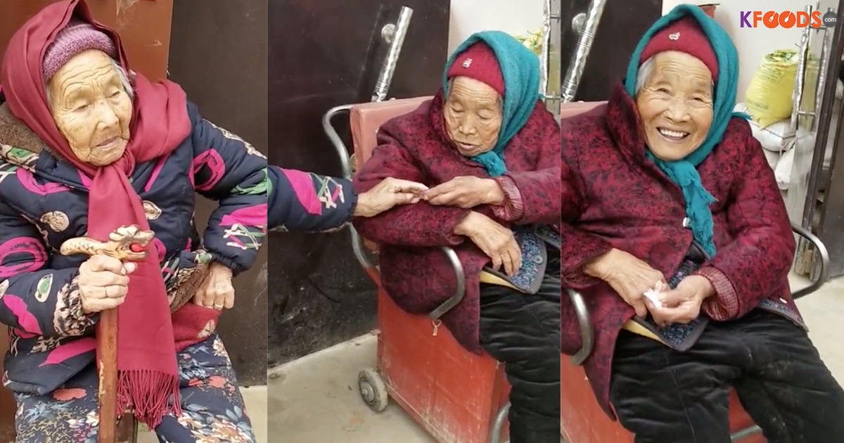 107 سالہ ماں اپنی 84 سالہ بیٹی سے محبت کا اظہار کر رہی ہے، اسی محبت کے اظہار کے طور پر ماں بیٹی کو ٹافی دے رہی ہے۔