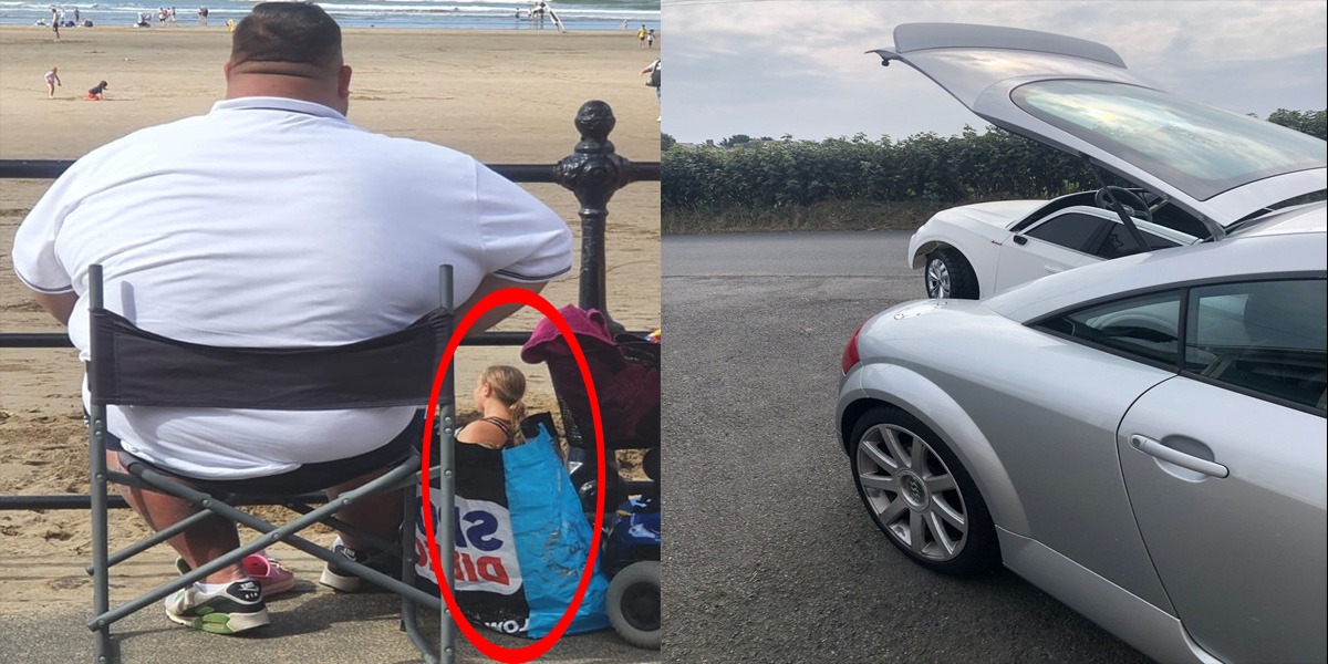 صحت مند آدمی کے نیچے رکھے تھیلے میں عورت نہیں بیٹھی بلکہ آدمی سے بہت نیچے ایک خاتون بیٹھی ہیں لیکن دیکھنے میں ایسا لگ رہا ہے جیسے وہ تھیلے کے اندر ہی ہیں۔