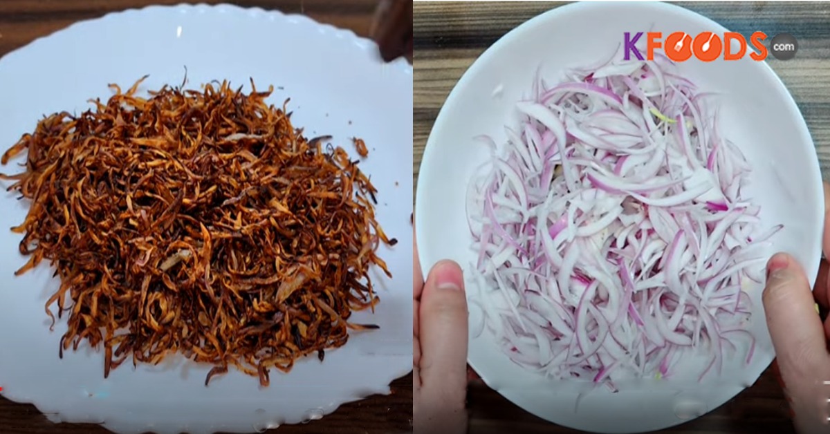 مشہور شیف اعجاز انصاری اپنے وی لاگ میں بتاتے ہیں کہ سب سے پہلے پیاز کو چھیل لیں اور باریک باریک کاٹ لیں۔ یہ کام آپ مشین کی مدد سے بھی کرسکتے ہیں۔ تمام موٹے حصے نکال لیں اور اس بات کا خاص خیال رکھیں کہ پیاز ایک جیسی کٹی ہوئی ہو۔