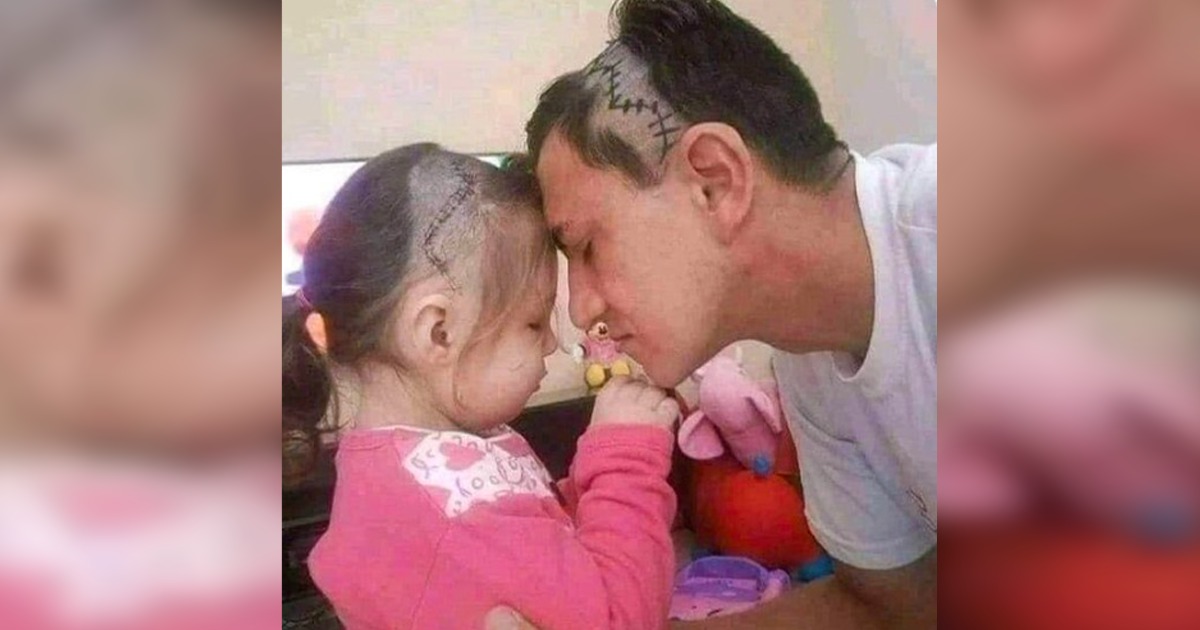 بیٹی کے دماغ کی سرجری کے بعد باپ نے بھی اُسی طرح بال کٹوا لیے ۔۔ باپ اور بیٹی کی محبت بھری تصویر نے لوگوں کو افسردہ کر دیا