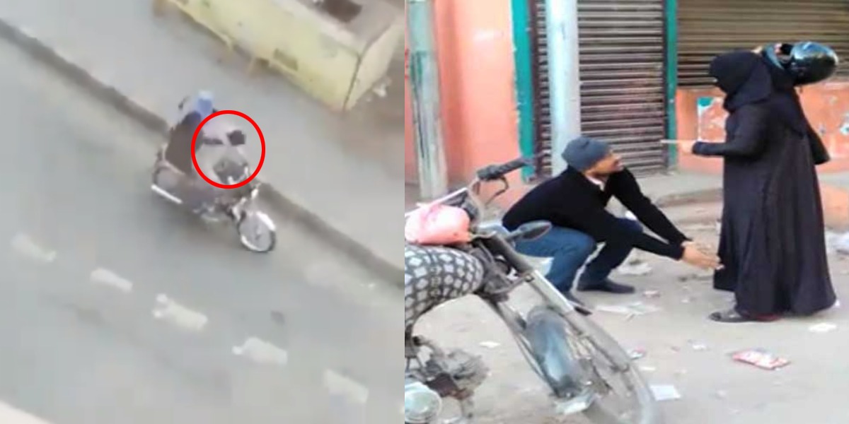 برقعے میں ملبوس اس خاتون نے پہلے تو اپنے خاوند کو زور دار طریقے سے لاتیں ماریں پھر مکے بھی مارے اور برا بھلا بھی کہا لیکن خاوند خاموشی سے اپنی بیوی کا یہ رویہ برداشت کرتا رہا۔