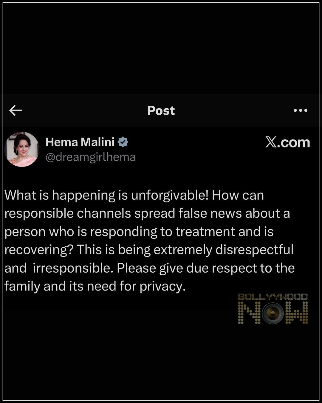 ساتھ ہی ہیما مالنی نے بھی اس تمام صورتحال سے دل گرفتہ نظر آئیں۔ انہوں نے میڈیا کے رویہ پر سخت تنقید کرتے ہوئے لکھا؛