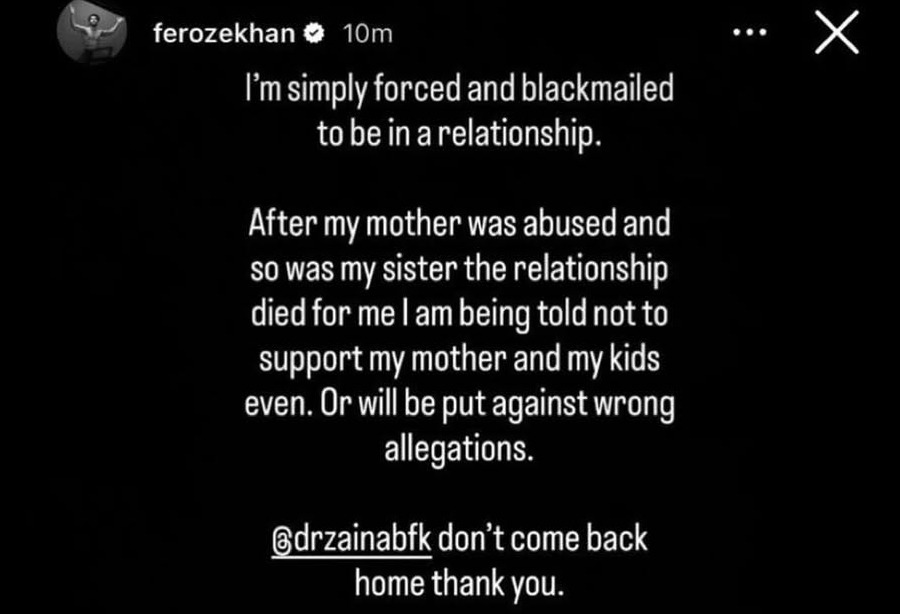 گزشتہ رات فیروز خان کے انسٹاگرام پر سامنے آنے والے اس پوسٹ نے مداحوں کو حیرت میں ڈال دیا۔ پوسٹ میں براہِ راست زینب کو تنقید کا نشانہ بنایا گیا اور یہ دعویٰ کیا گیا کہ وہ نہ صرف شوہر کے ساتھ بلکہ ان کے والدین اور بچوں کے ساتھ بھی عزت و احترام کا رویہ نہیں رکھتیں۔