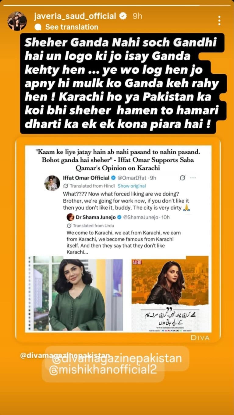 Javeria Saud Calls Out Saba Qamar And Iffat Omar For Their Anti Karachi Comment