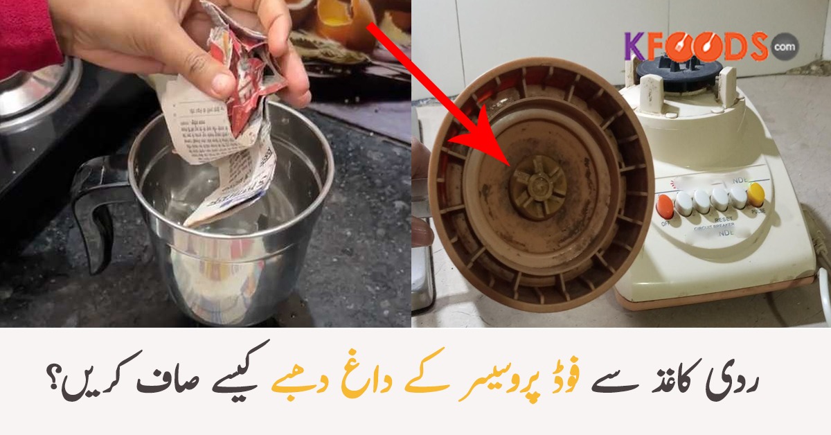 فوڈ پروسیسر کے نیچے کے حصوں اور اس کی باڈی کو اسفنج یا کسی کھردری چیز سے رگڑ کر صاف نہیں کیا جاسکتا کیوں کہ اس سے اس کی باڈی خراب ہوسکتی ہے یہی وجہ سے کہ خواتین اسے بہت تفصیل سے خراب نہیں کرتیں۔ آپ ایک پرانا اخبار یا کسی پرانی کاپی کے صفحات لیں اور اسے پانی میں بھگو دیں۔ اس کاغذ کو ہاتھ سے مل کر بالکل نرم سے پیسٹ بنا لیں۔ ایک چمچ بیکنگ سوڈا، ایک چمچ نمک، ١ سمس لیکوئیڈ سوپ ملا کر اچھی طرح مکس کریں۔