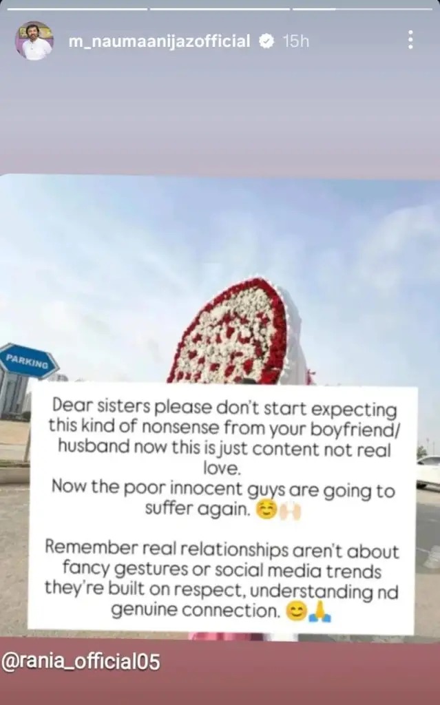 اُن کا کہنا تھا، برائے مہربانی لڑکیاں اپنے بوائے فرینڈ یا شوہروں سے اس طرح کی بے تکی امید نہ رکھیں کیونکہ یہ سب نوجوان لڑکیوں کو گمراہ کرے گا۔ وہ سمجھیں گی کہ محبت کا مطلب ہے لاکھوں کا تحفہ، جبکہ اصل رشتہ محبت، عزت اور سمجھوتے سے بنتا ہے، نہ کہ سوشل میڈیا کے اسٹنٹس سے۔
