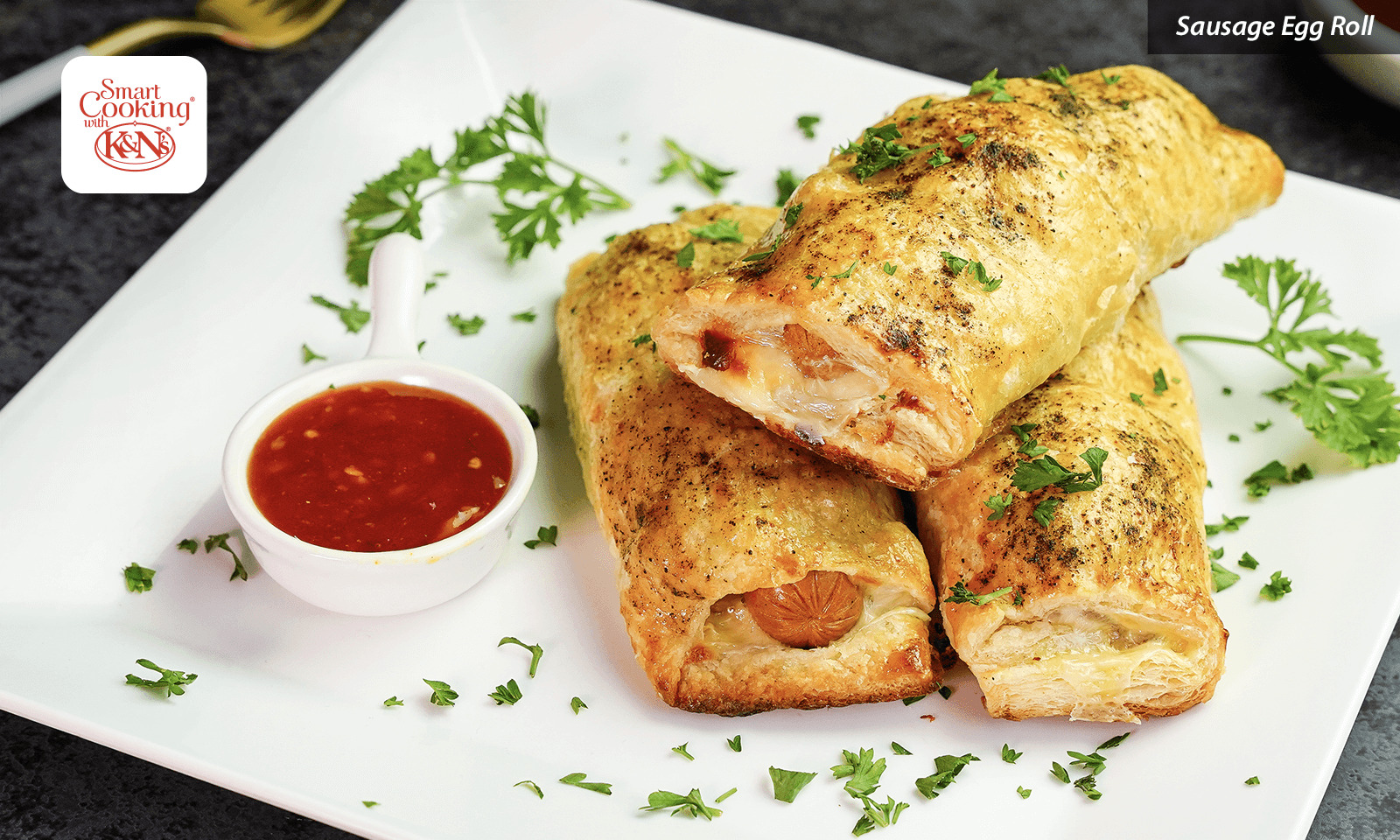Cut puff pastry into 9 equal parts in square shape. Add a layer of scrambled eggs on dough, top it with cheddar cheese and place K&N’s Frankfurter Sausage.
